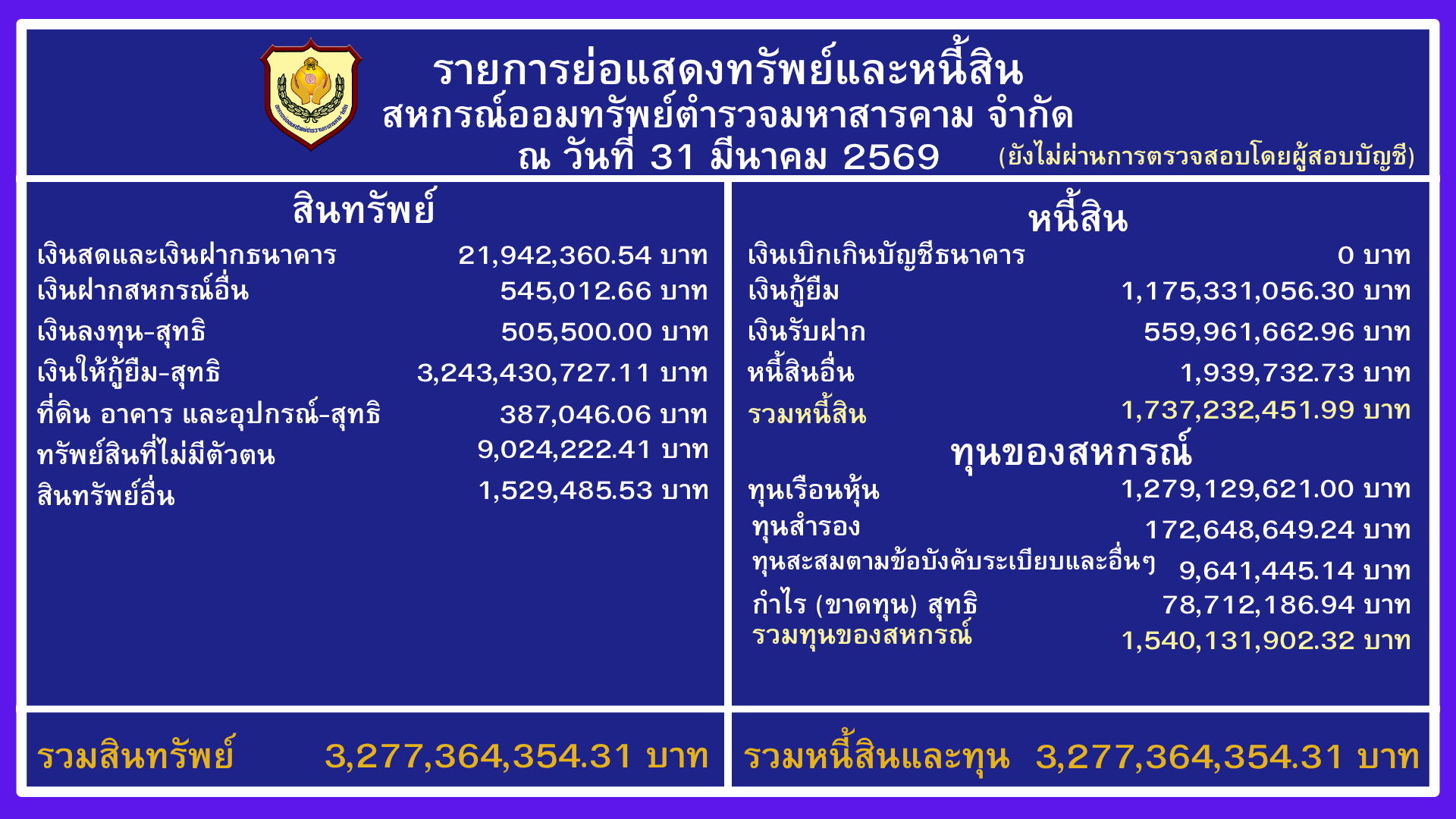 รายการย่อแสดงทรัพย์สินและหนี้สิน รายการย่อแสดงทรัพย์สินและหนี้สิน (อย่างย่อ) ณ วันที่ 30 กันยายน 2568 Share Facebook Twitter Pinterest Linkedin