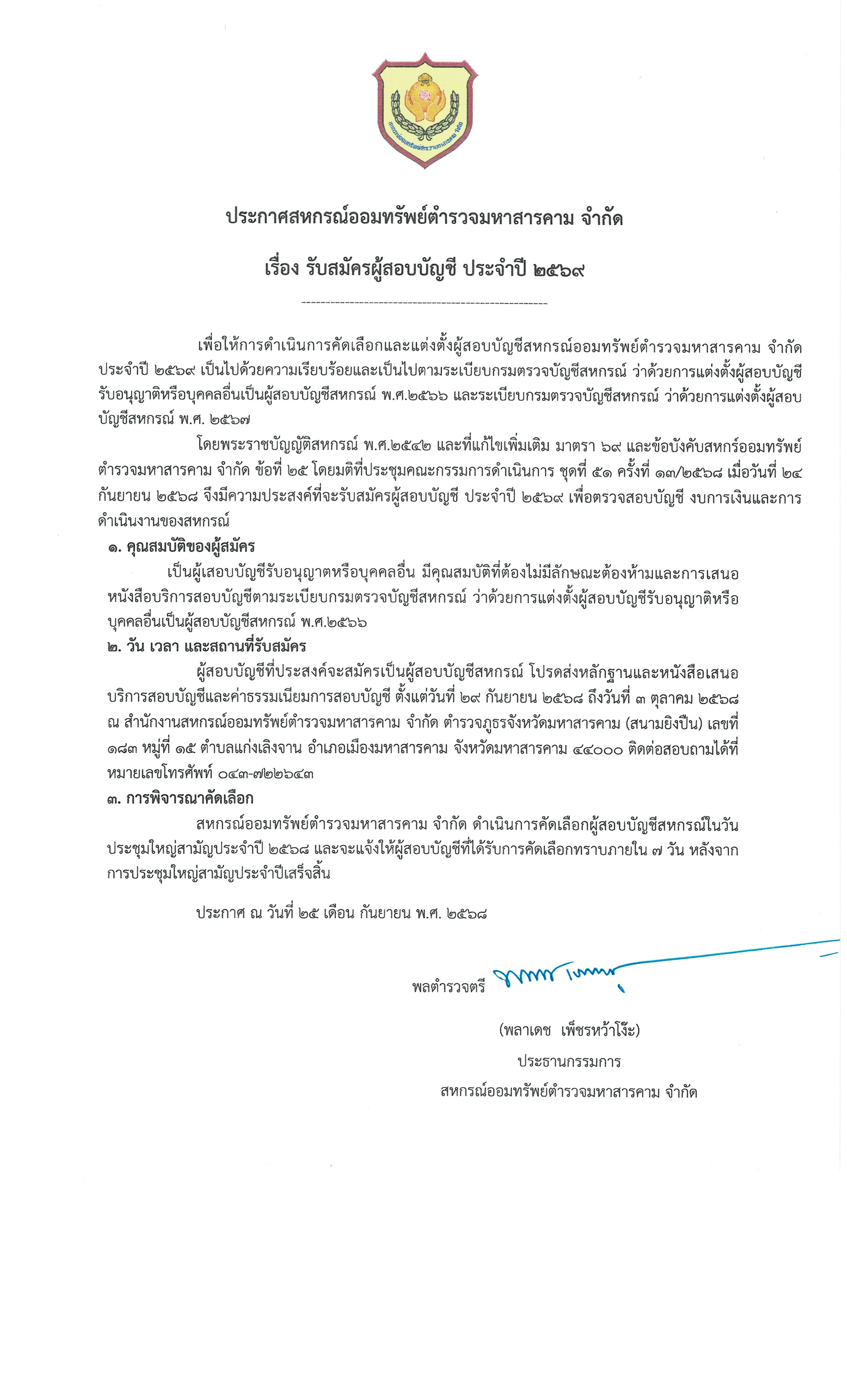 ประกาศ เรื่อง รับสมัครผู้สอบบัญชี ประจำปีบัญชี 2569 2025-09-262025-09-26 ผู้เข้าชมทั้งหมด: 364 เรื่อง รับสมัครผู้สอบบัญชี ประจำปีบัญชี 2569 Share Facebook Twitter Pinterest Linkedin
