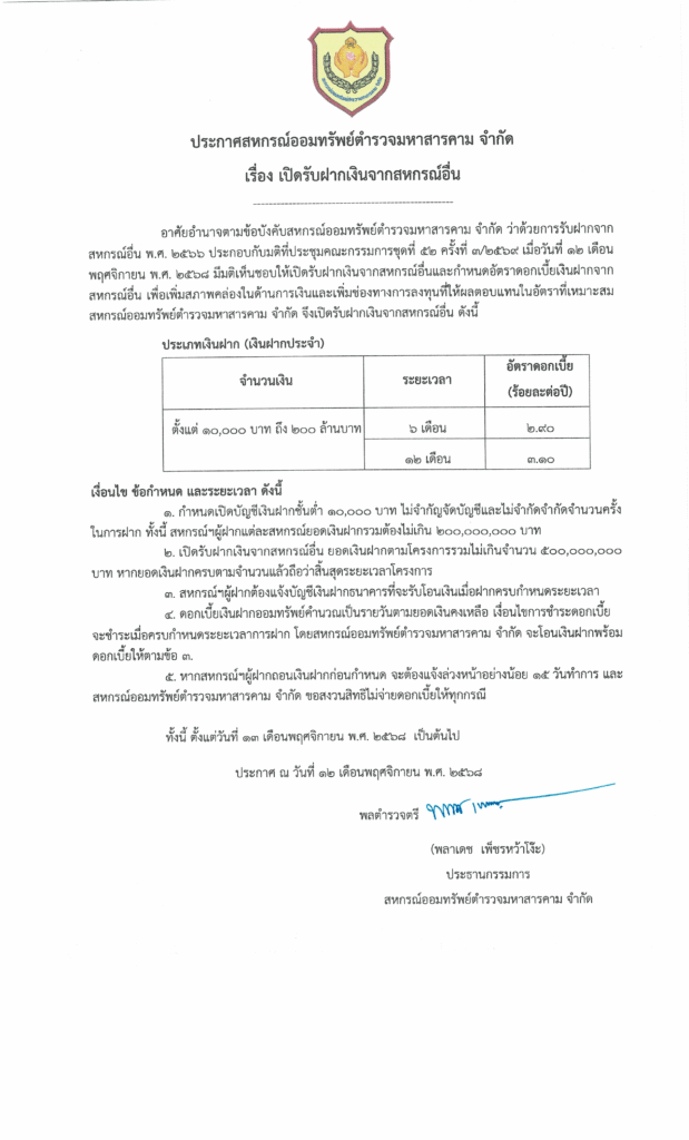 ประกาศ ประกาศสหกรณ์ออมทรัพย์ตำรวจมหาสารคาม จำกัด เรื่อง เปิดรับฝากเงินจากสหกรณ์อื่น 2025-12-01 เรื่อง เปิดรับฝากเงินจากสหกรณ์อื่น